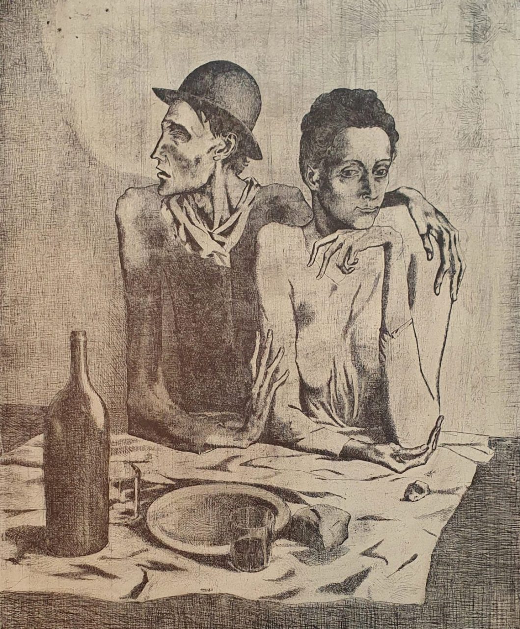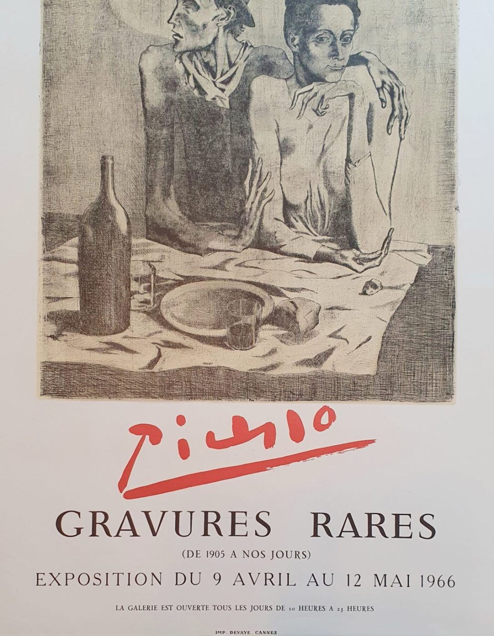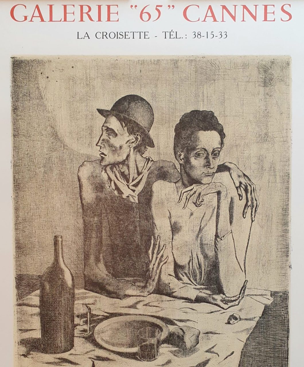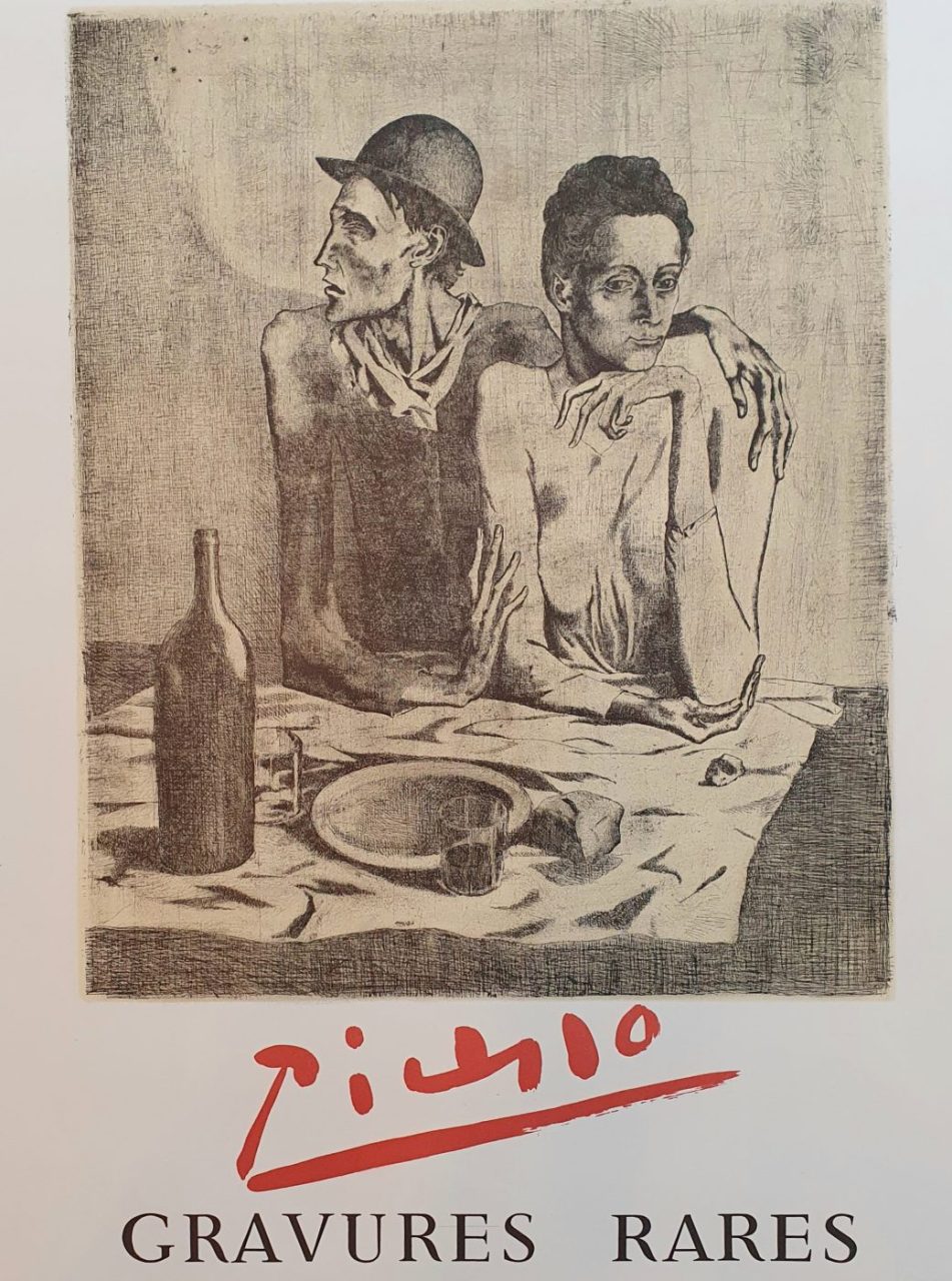 The poster features one of Picasso's most famous etchings from 1904 titled 'Le Repas Frugal' or The Frugal Meal. It was Picasso’s second-ever etching and was completed when the artist was only 23 years old. Still considered one of his most accomplished graphic works, it is highly regarded as the final masterpiece of his Blue Period. Reflecting Picasso’s preoccupation with the world around him, Le repas frugal , pays homage to his Spanish roots, while examining the circumstances of his new home in modern Paris. Emaciated and elongated, the gaunt, yet understatedly elegant couple recalls El Greco’s portraiture. The heavily etched lines that connect the sitters emphasizes their supportive relationship and heightens the sense of human intimacy and melancholy. The woman, who engages the viewer, is believed to have been inspired by Madeleine, Picasso’s then-lover. Her blind companion, appearing in profile, remains unidentified.