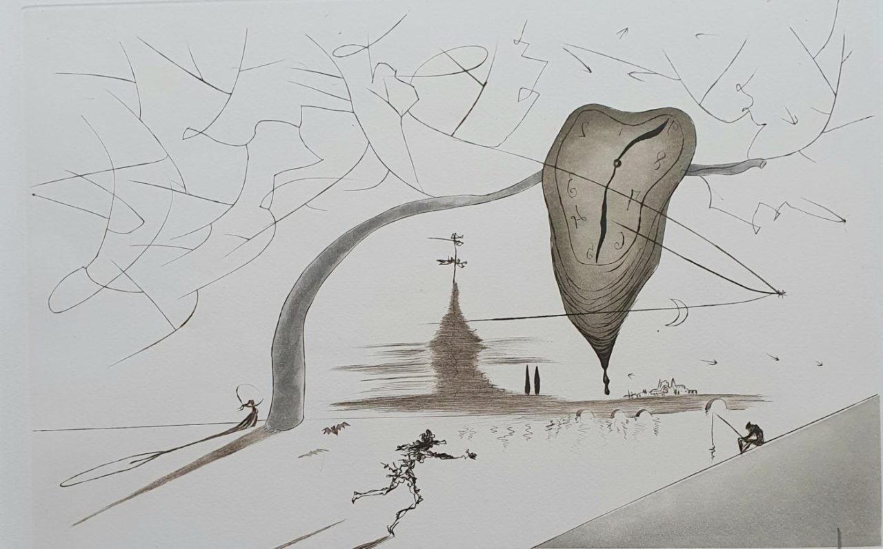 'Aurelia' is French poet and novelist Gérard de Nerval’s account of his descent into madness - a condition provoked in part by his unrequited passion for an actress named Jenny Colon. Dali was commissioned in the 1970's to produce 4 illustrations and stand alone prints to accompany a new publication of the work. Here, in one titled 'Memorabilia' he has introduced several of his classic surrealist motifs ; the melting clock (representing the fluidity of time and the dream world) , a young girl with a skipping rope (representing happy childhood memories) and a bat (representing death).