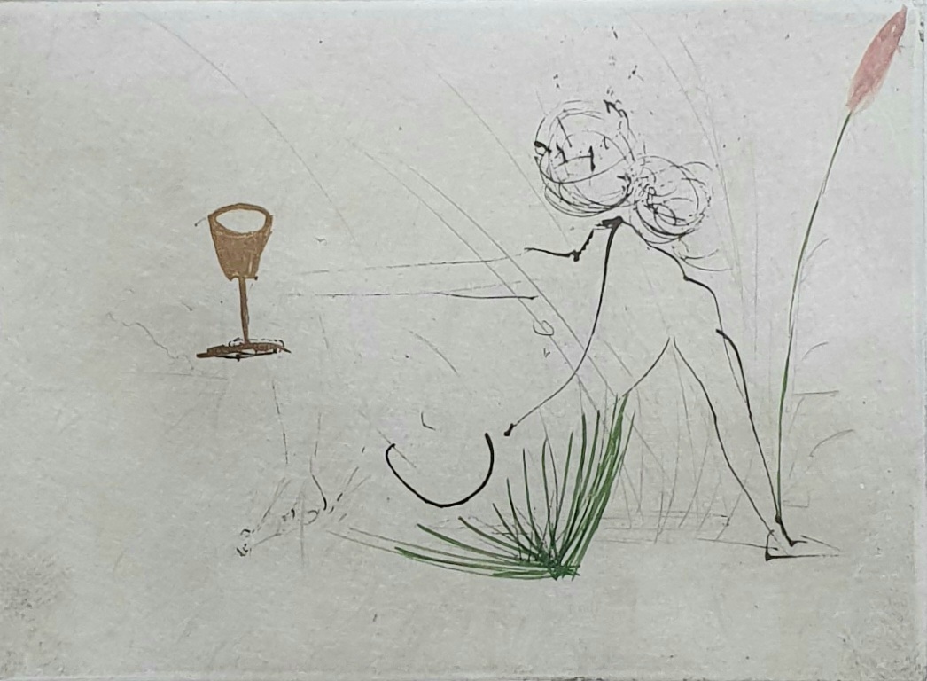 A lovely etching with hand colouring in watercolour by Salvador Dali from 'Petits Nus - Ronsard'. This is Plate VII from the suite to accompany the book 'Les Amours de Cassandre'. It is signed in pencil and numbered 42/95. It is float-mounted on Japon paper with the Dali blindstamp. Modern black frame. Field 42Details