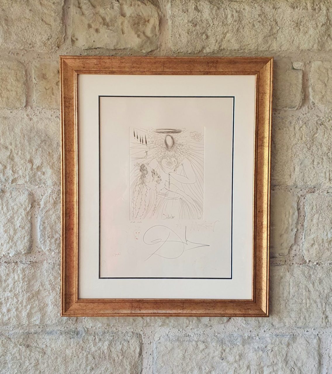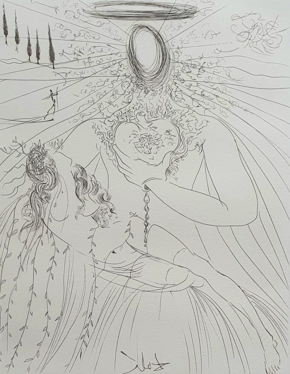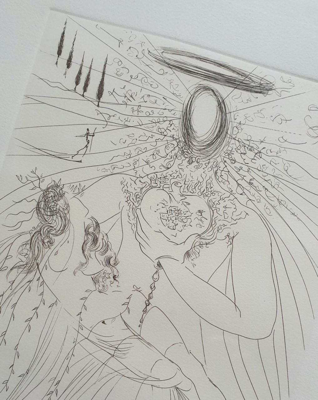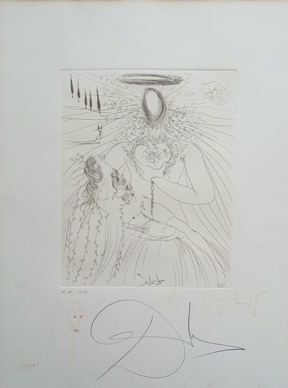 To ev’ry captive soul and gentle heart is the first line of a sonnet by Dante which appeared in his book of prose and sonnets ‘La Vita Nuova’ published in 1294. It contains 42 brief chapters with 25 sonnets, one ballata, and four canzoni ; one canzone (or ballad) is left unfinished, interrupted by the death of Beatrice Portinari, Dante's lifelong love. This etching by Dali is probably a depiction of Dante’s love of Beatrice.