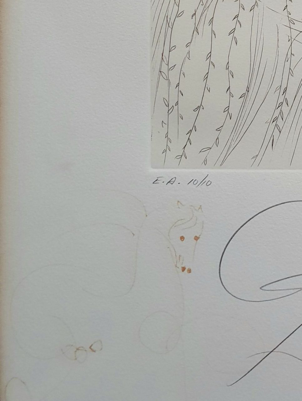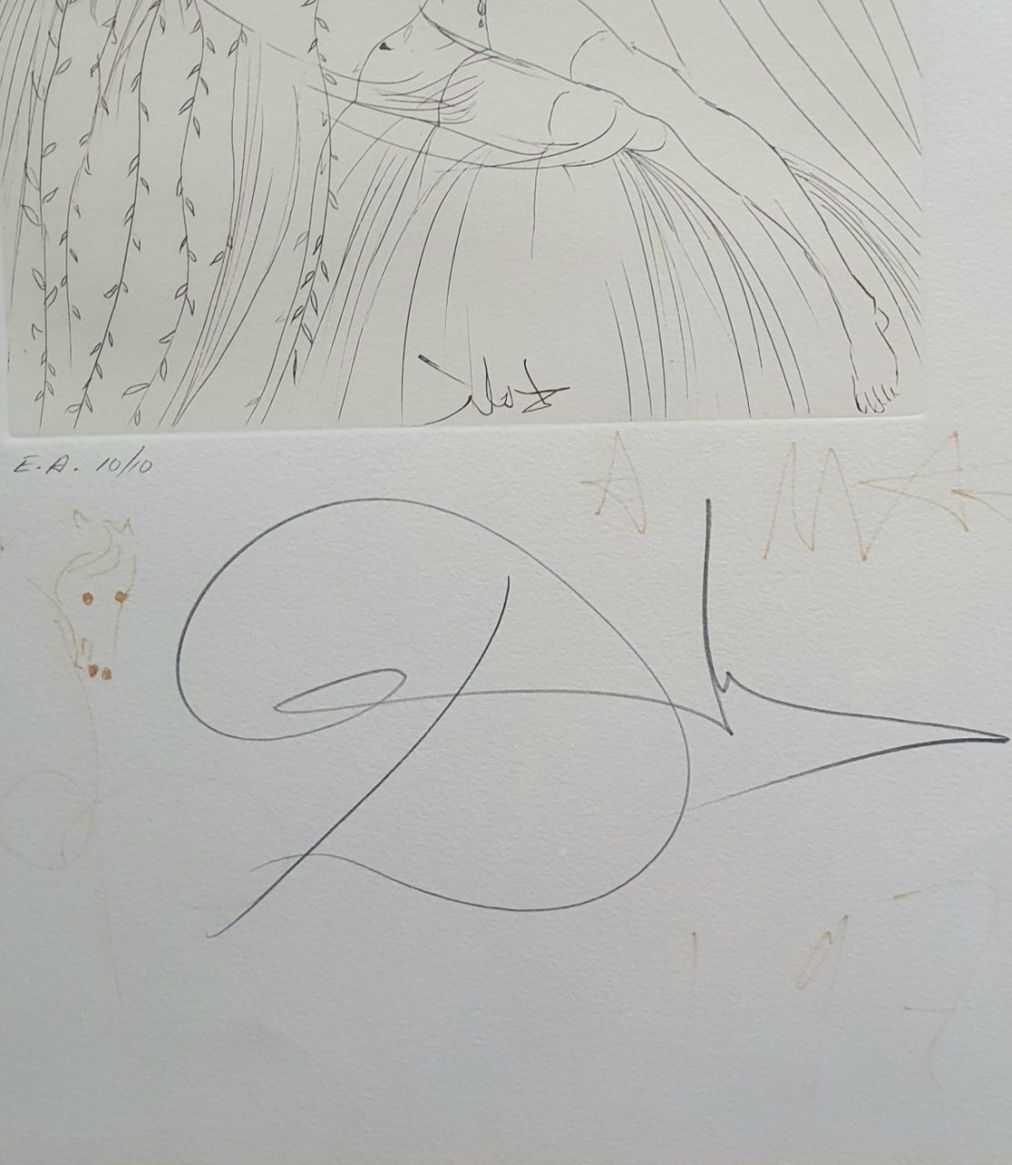 A fabulous artist proof etching on wove paper from the Spanish great, Salvador Dali. Signed in pencil and numbered 10/10 E.A. with a sketch of a stallion to the margin possibly by Dali himself. Field 90. Modern gilt frame.Details